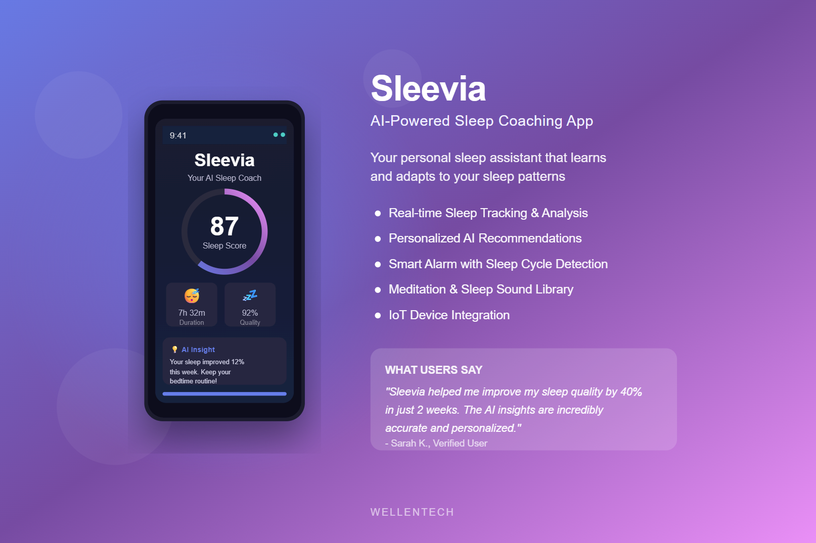 슬리비아는 AI 기반의 스마트 수면 코칭 앱으로, 사용자의 수면 패턴을 분석하고 개인에게 최적화된 수면 솔루션을 제공합니다. 정교한 알고리즘을 통해 수면의 질을 향상시키고, 매일 밤 더 나은 휴식을 취할 수 있도록 돕습니다.